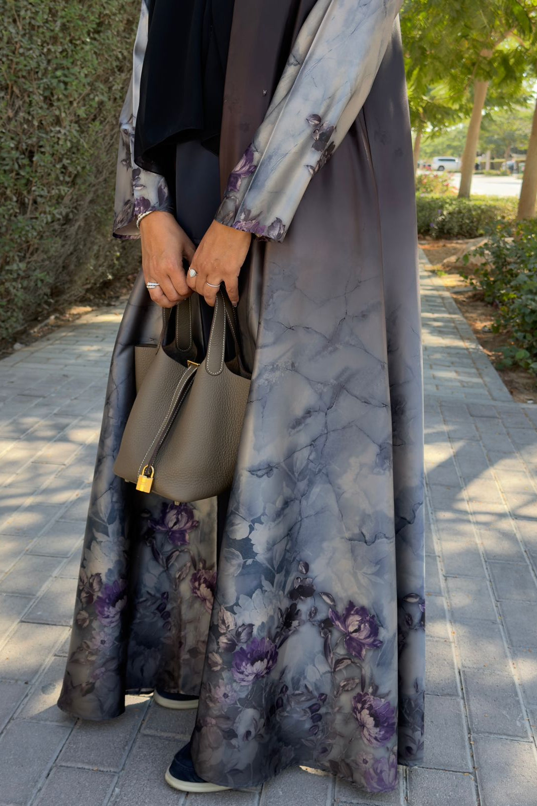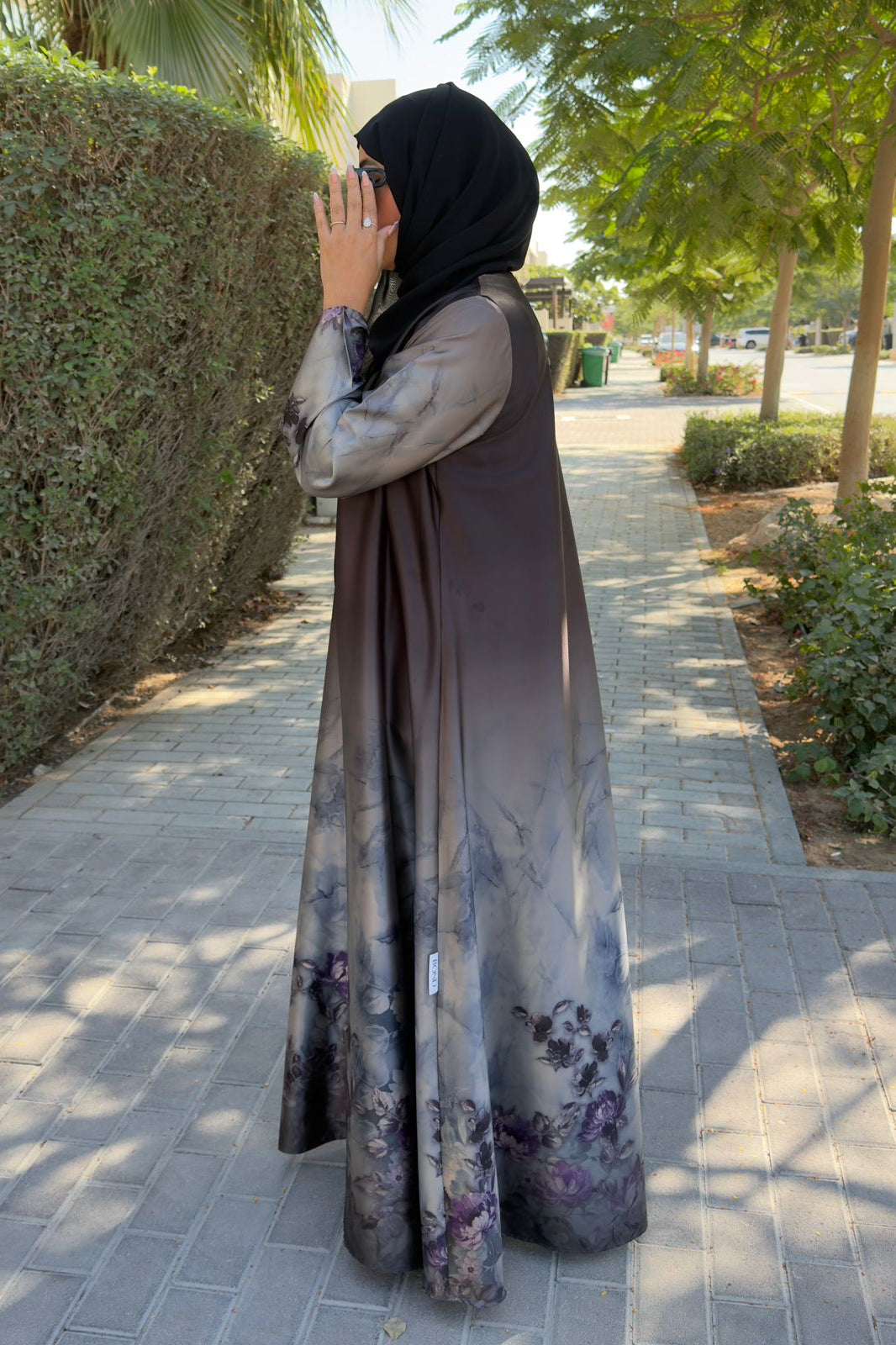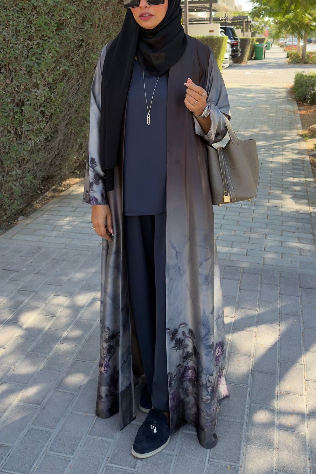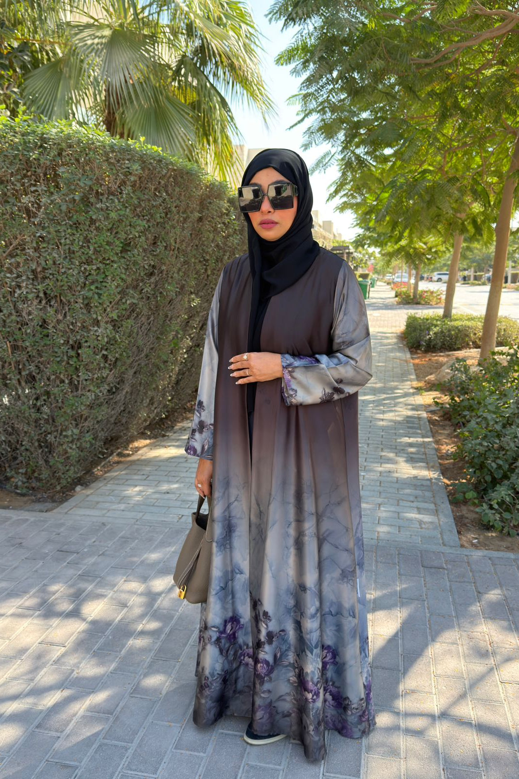 Mahra Abaya With Scarf - Gray Flower Embroidery