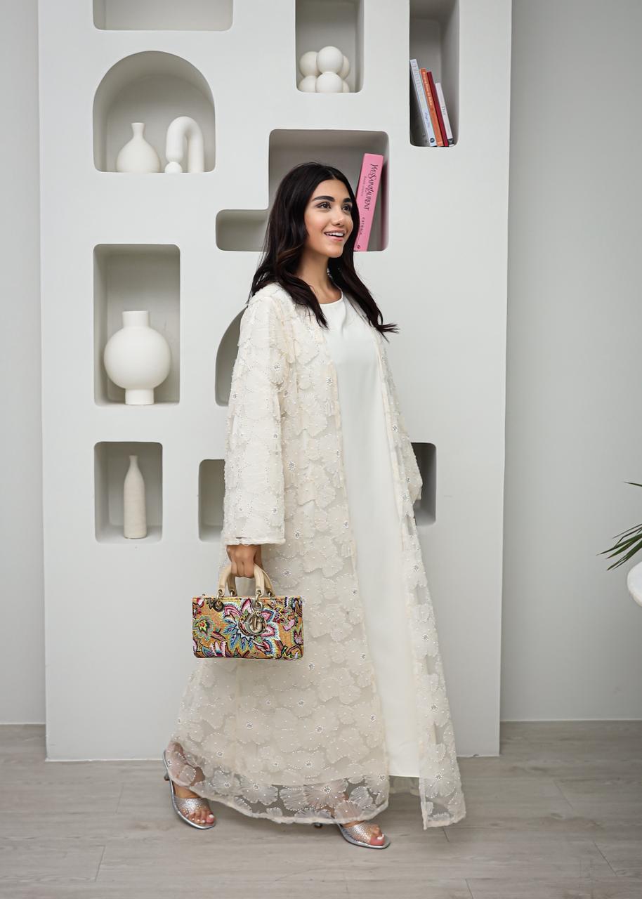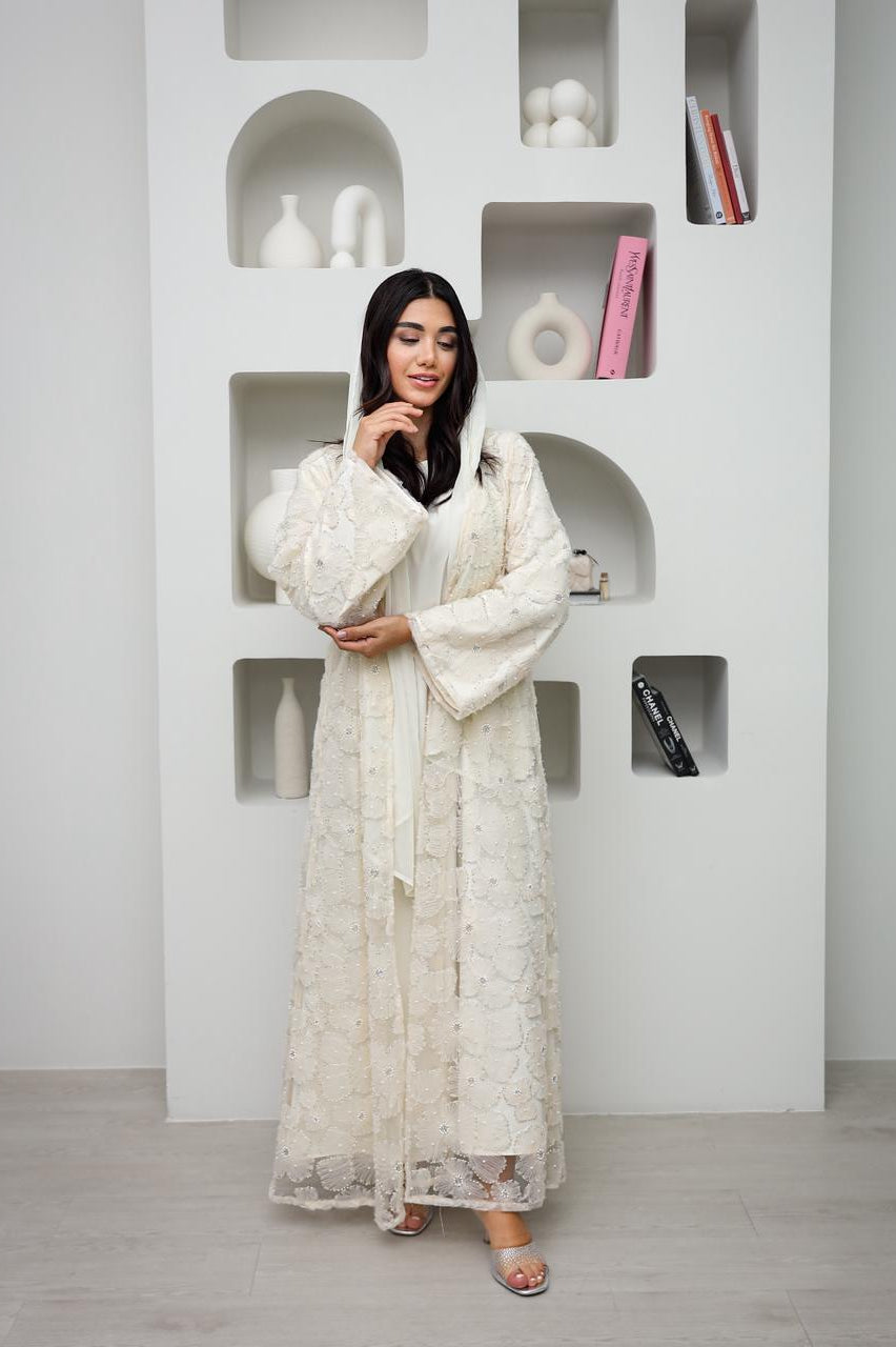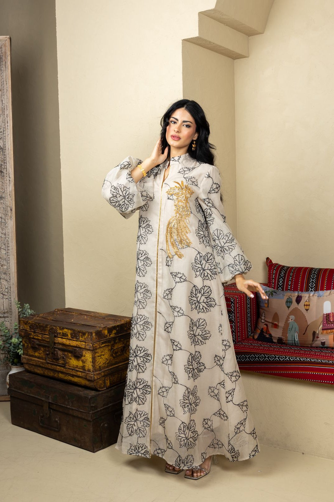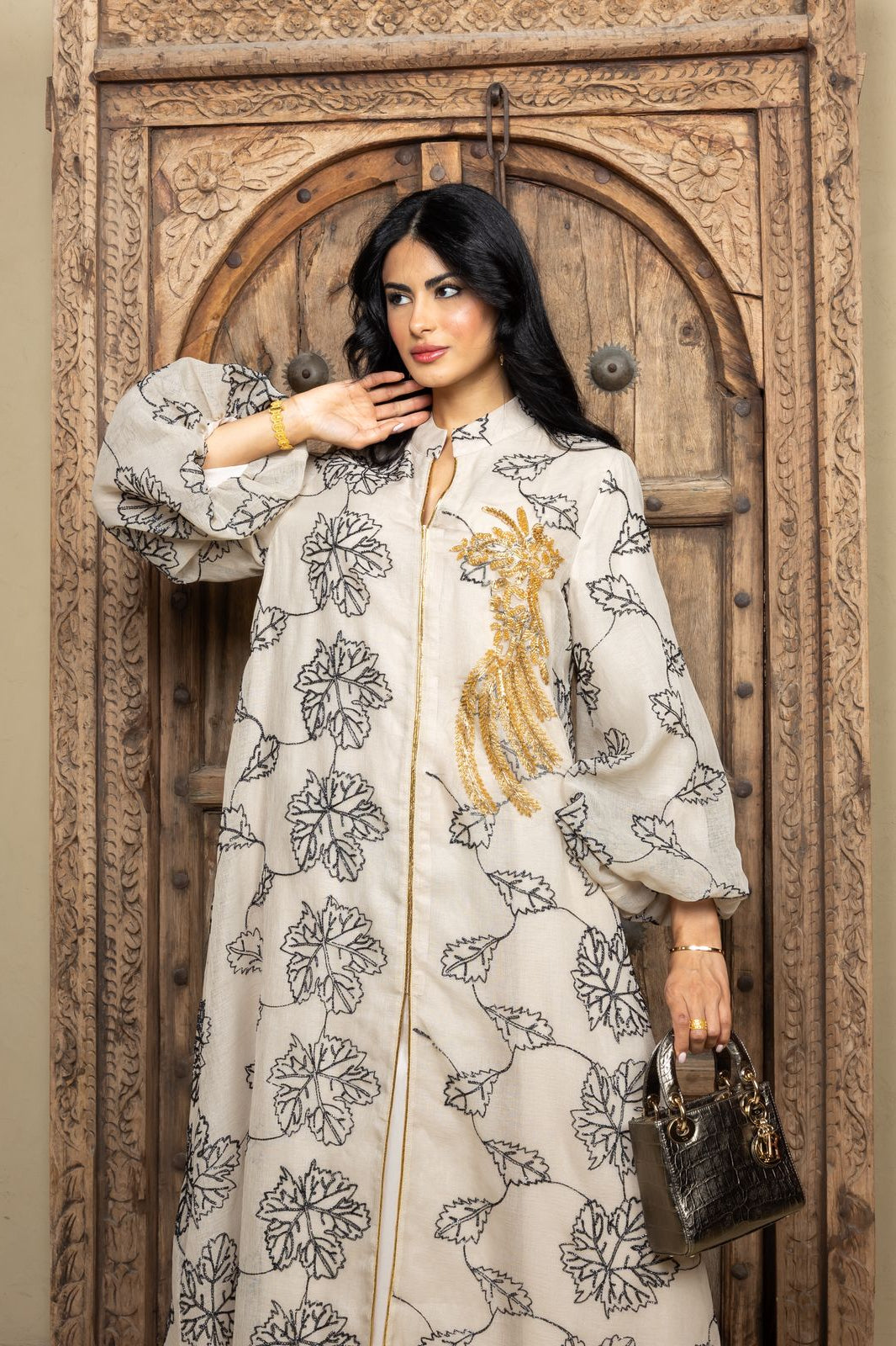 Mahra Abaya With Scarf - Beige Flower Embroidery
