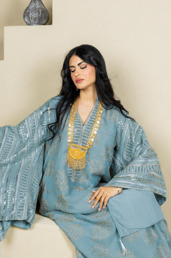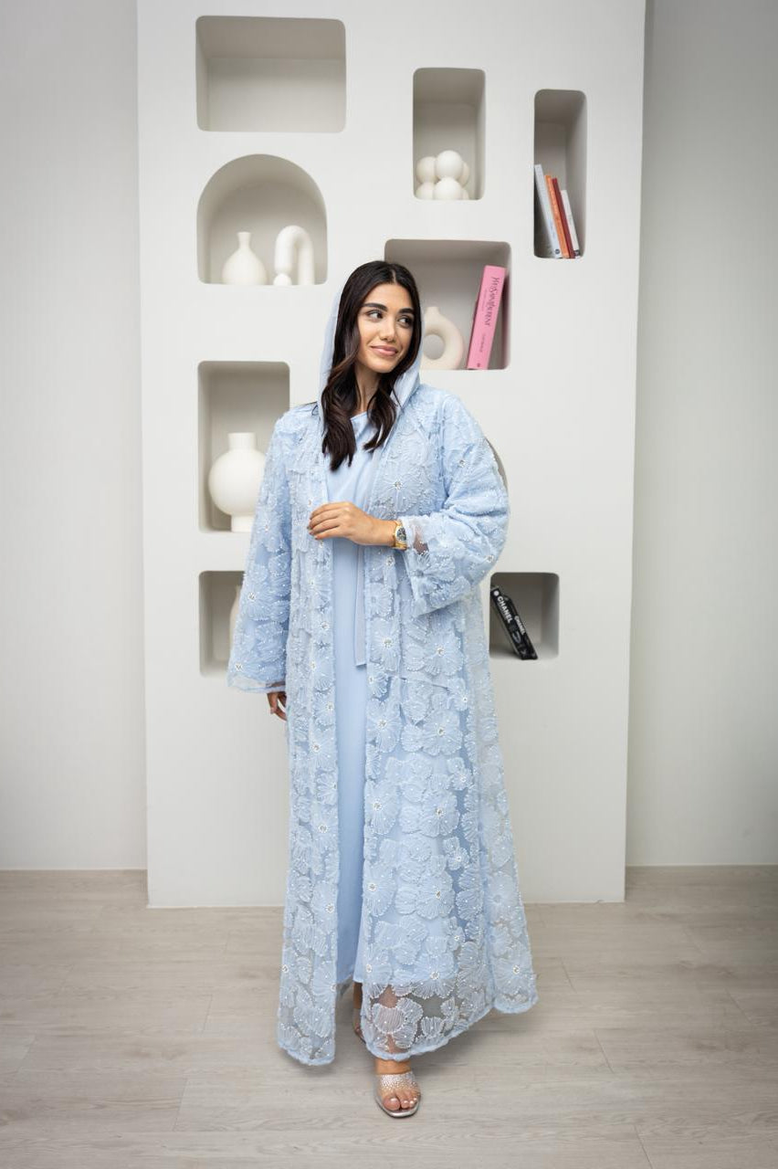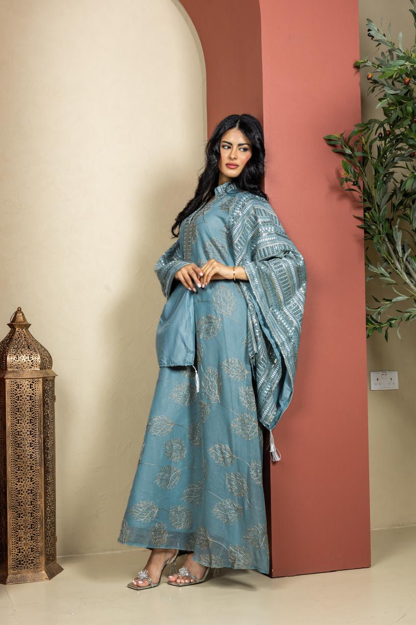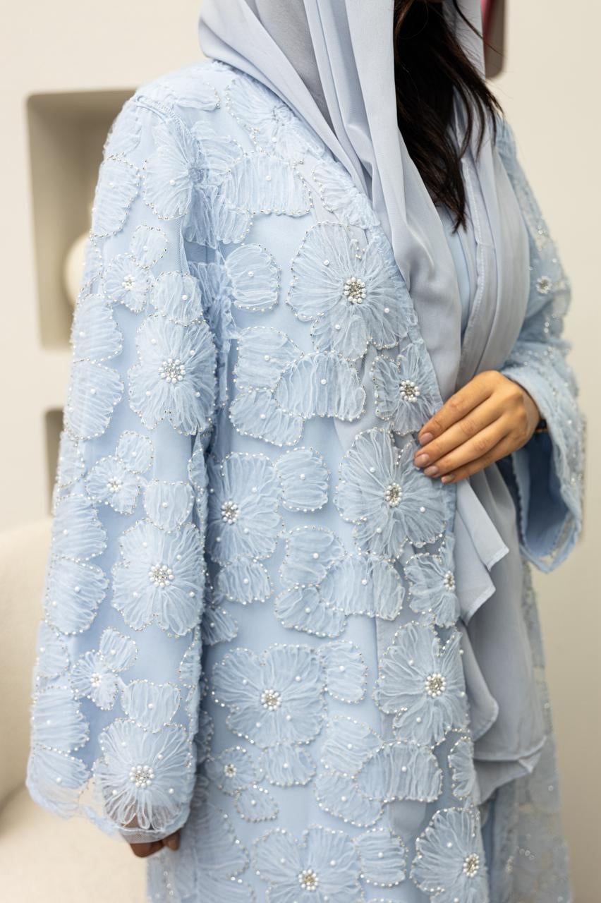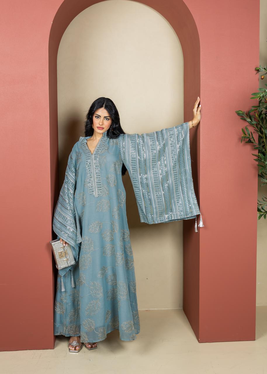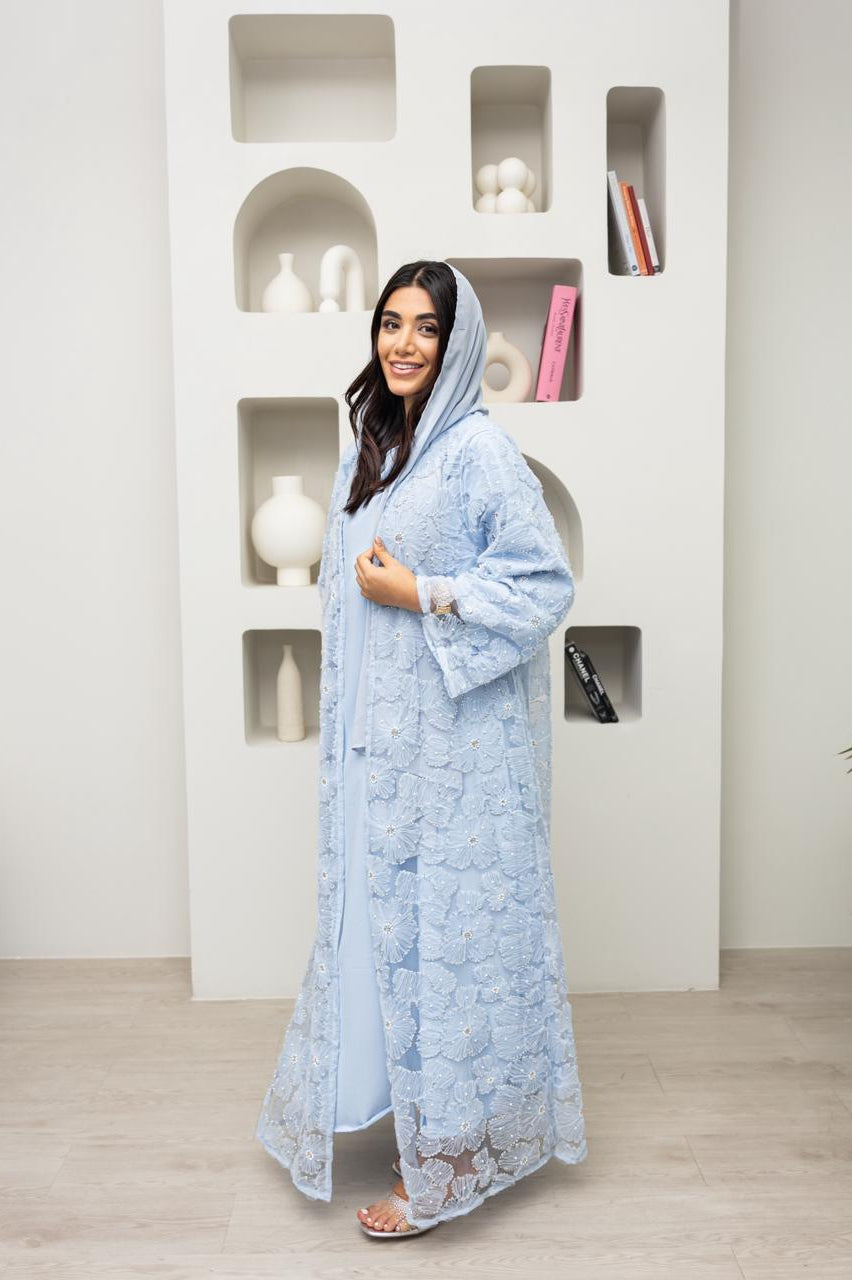 Mahra Abaya With Scarf - Blue Flower Embroidery