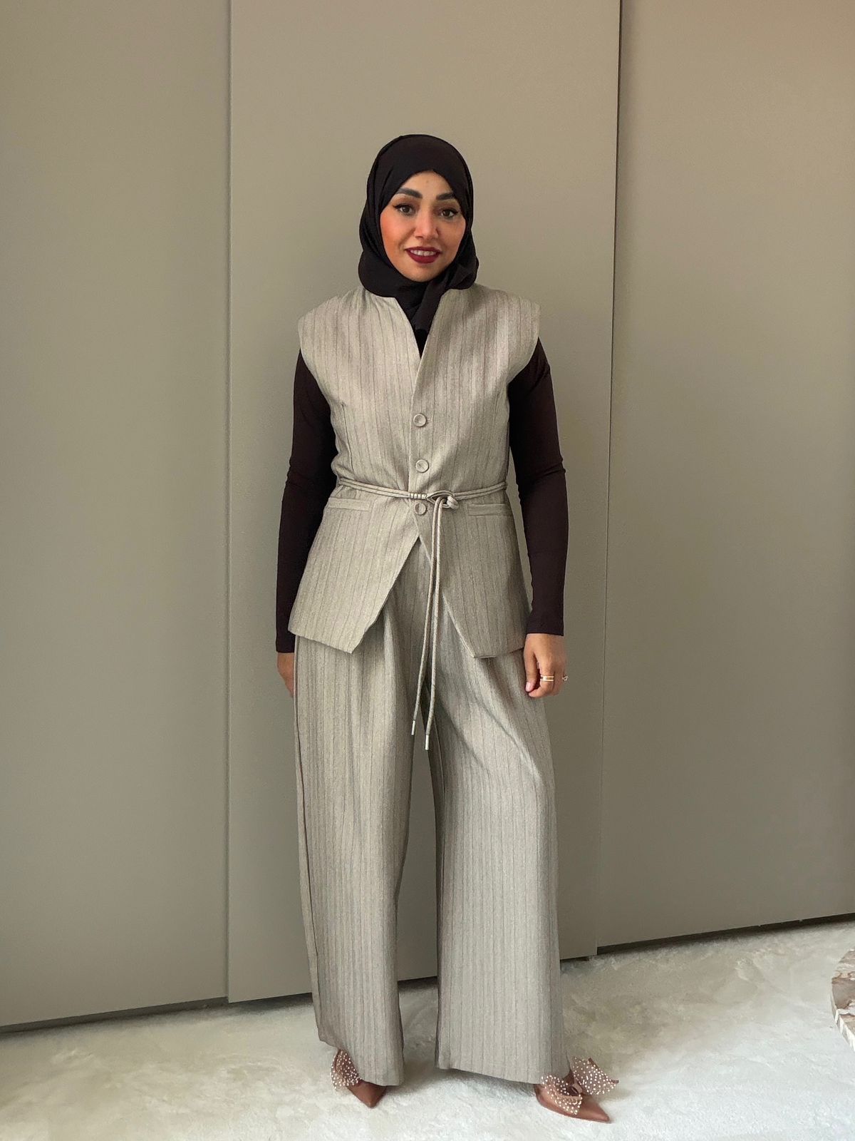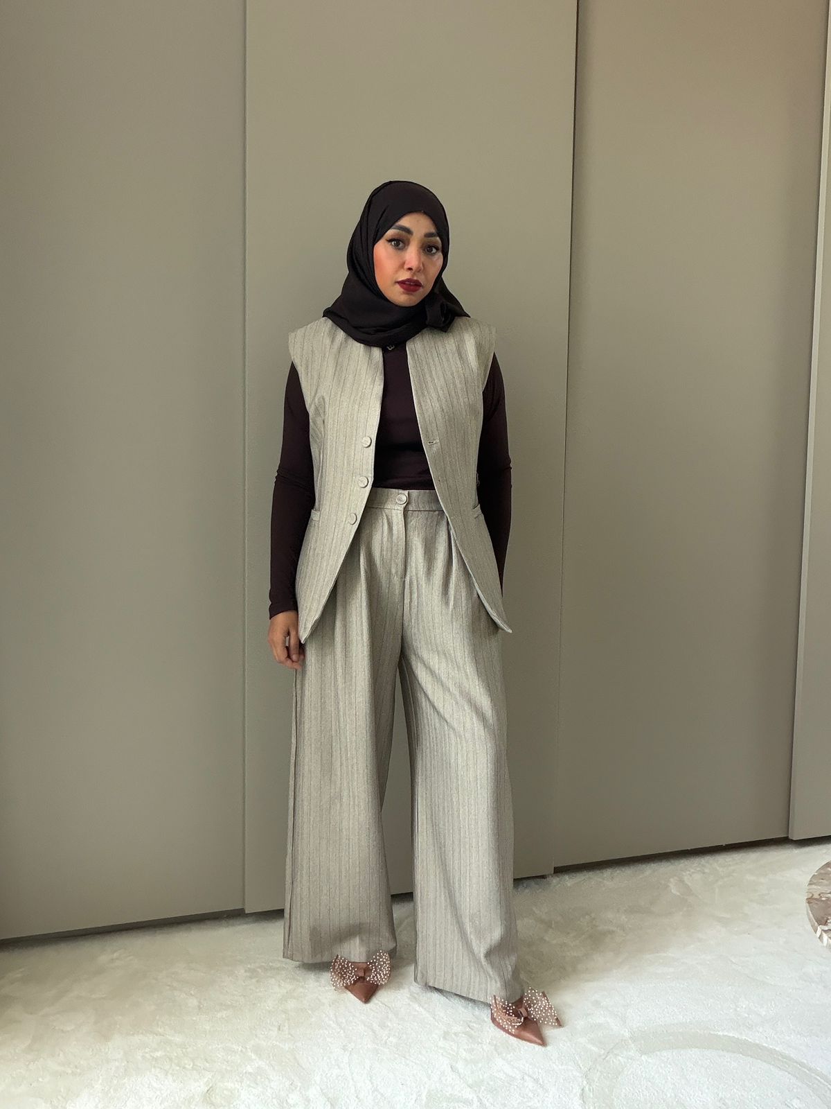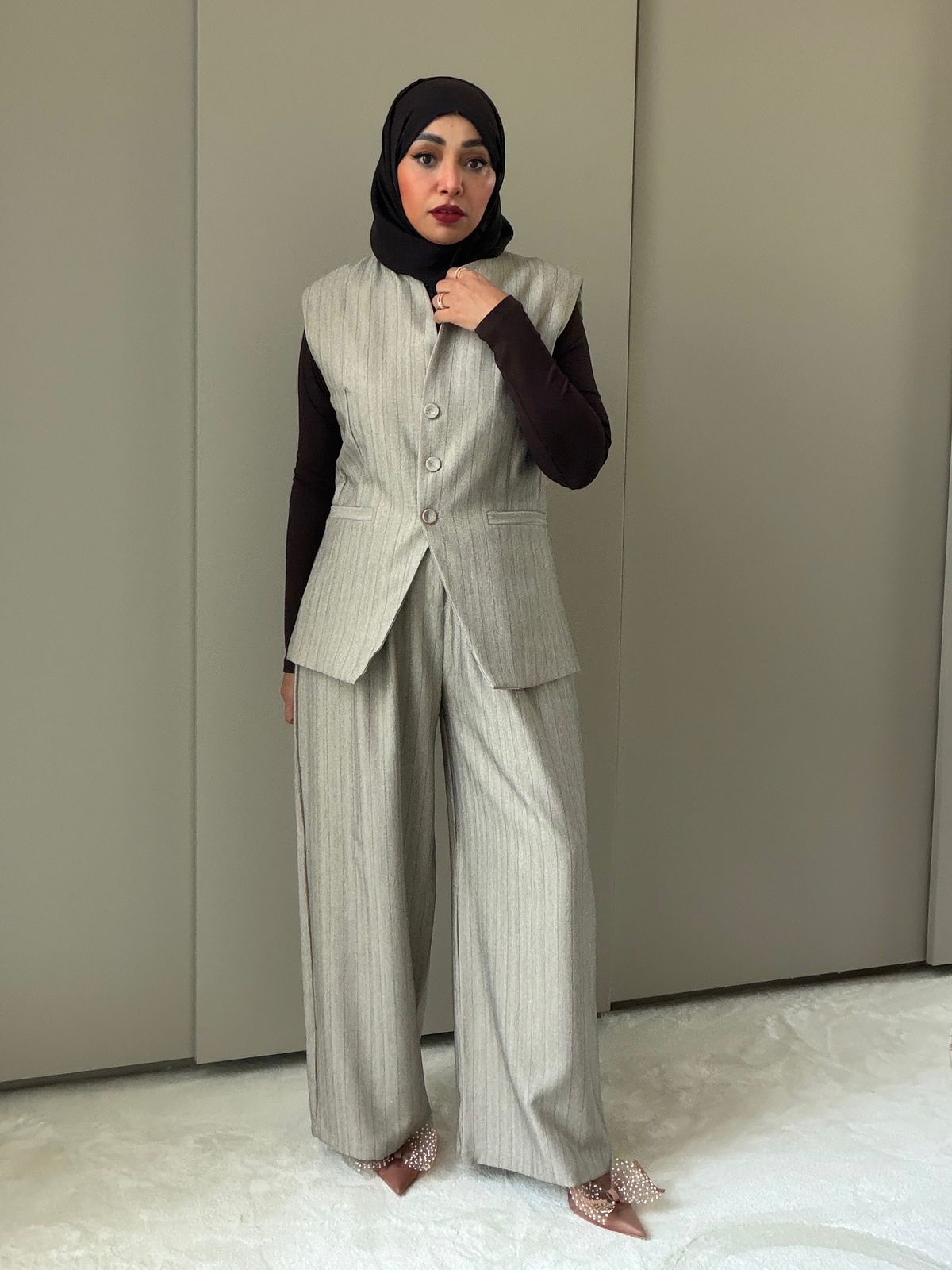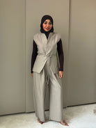 Refined tailoring meets effortless modest elegance with this Bond two-piece set. Designed for the modern woman, this coordinated waistcoat and wide-leg pants ensemble offers a powerful yet graceful silhouette suitable for workdays, meetings, and elevated everyday wear.