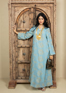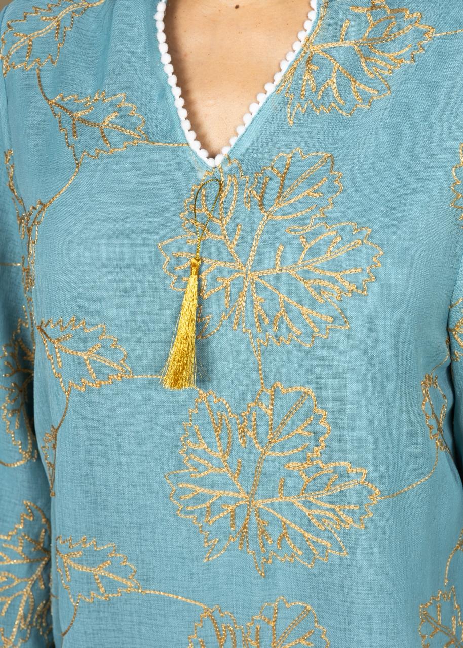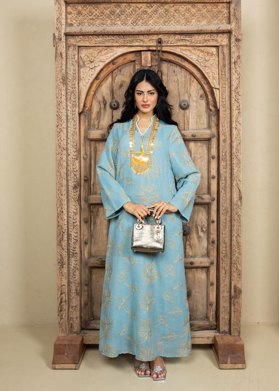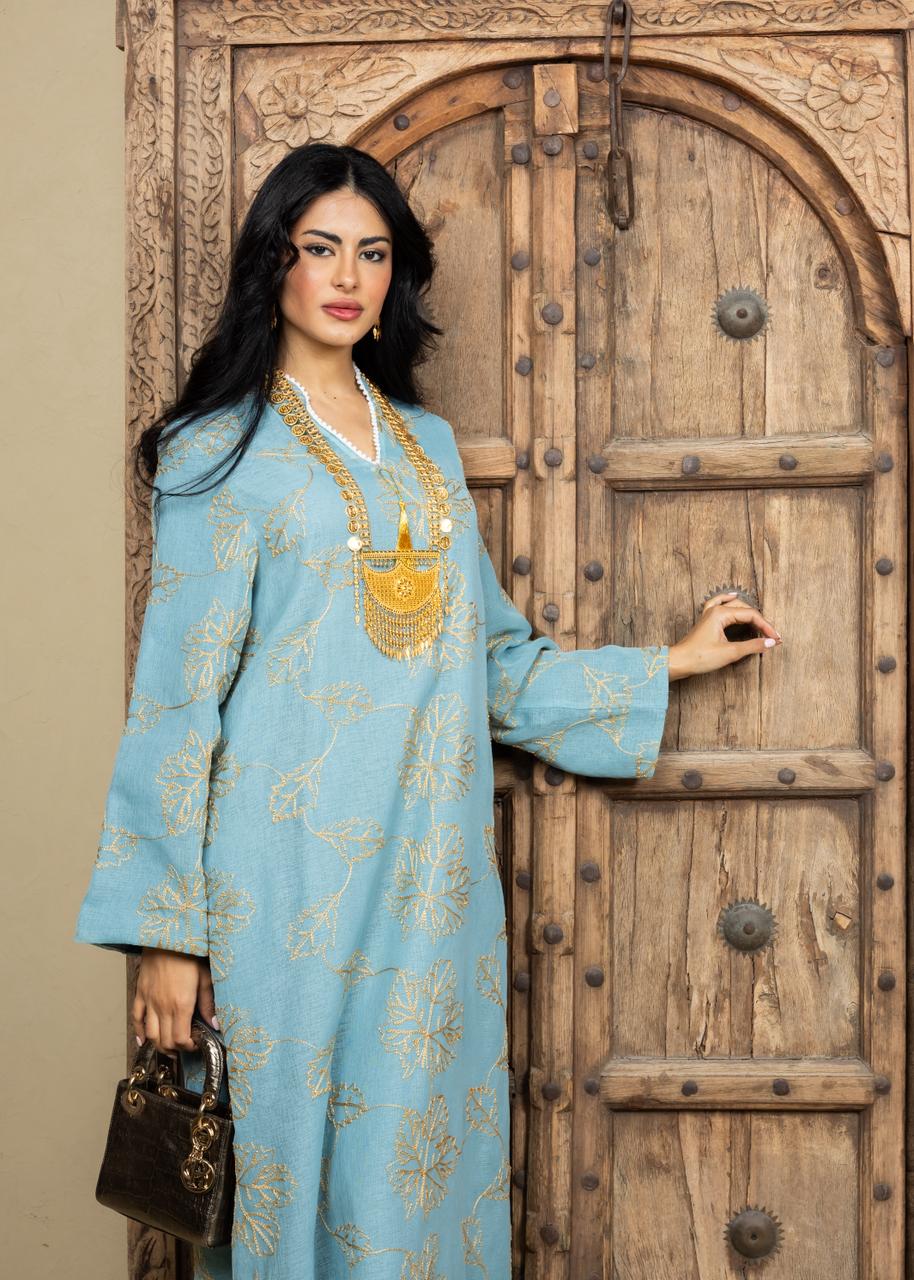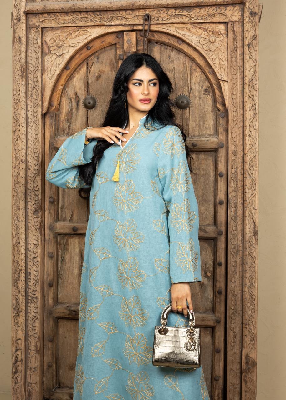 A refined Ramadan caftan crafted from lightweight linen, designed in a relaxed, elegant silhouette. Detailed with delicate gold leaf embroidery throughout and finished with a soft tassel neckline accent for a subtle touch of luxury. Effortless, breathable, and perfect for both daytime Ramadan gatherings and serene evening occasions.