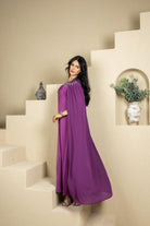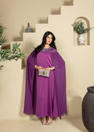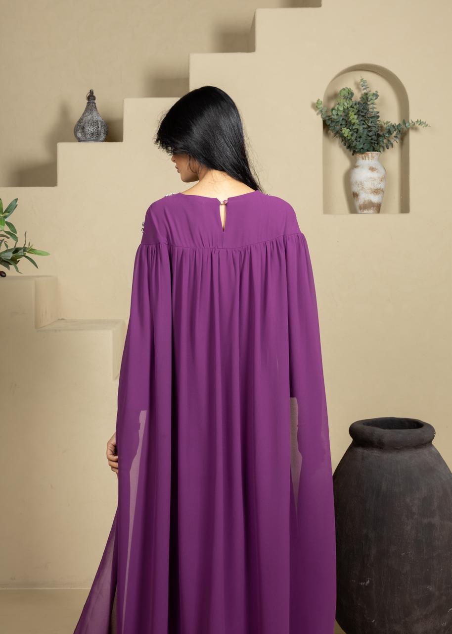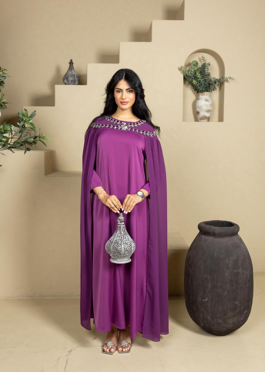 An elegant caftan designed for Ramadan evenings, crafted in a flowing silhouette that drapes beautifully. Featuring refined crystal embellishments along the neckline for a subtle touch of luxury, with soft cape-style sleeves that add grace and movement. Perfect for iftar gatherings and special occasions, combining modesty with timeless sophistication.