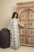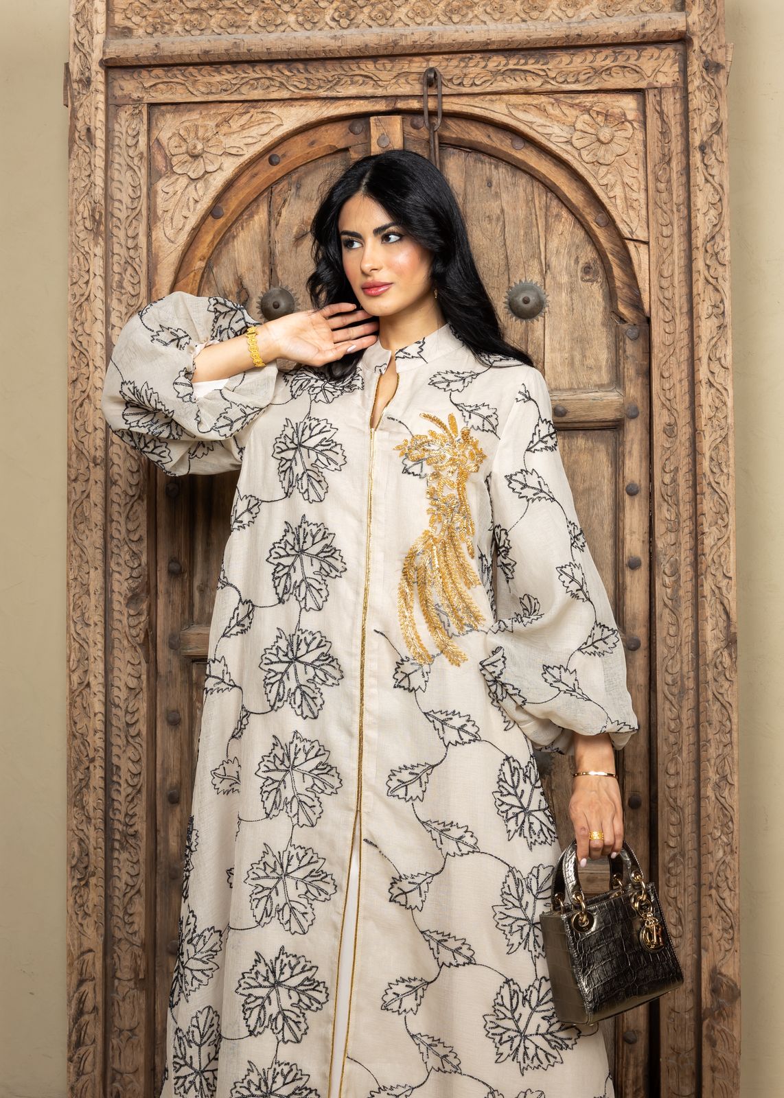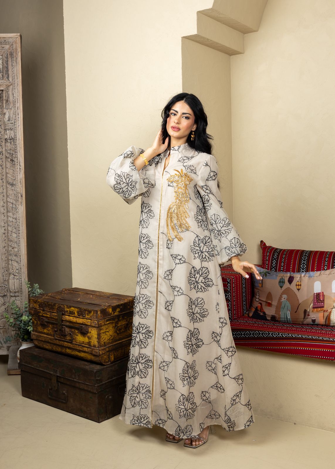 An elegant Ramadan caftan designed in a flowing silhouette with softly structured puff sleeves that add a refined, feminine touch. Crafted from lightweight fabric featuring a delicate leaf-inspired print, and accented with hand-applied gold beaded embroidery for subtle sophistication. The clean front line and graceful drape make this piece ideal for Ramadan gatherings and special evening occasions.
