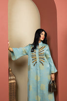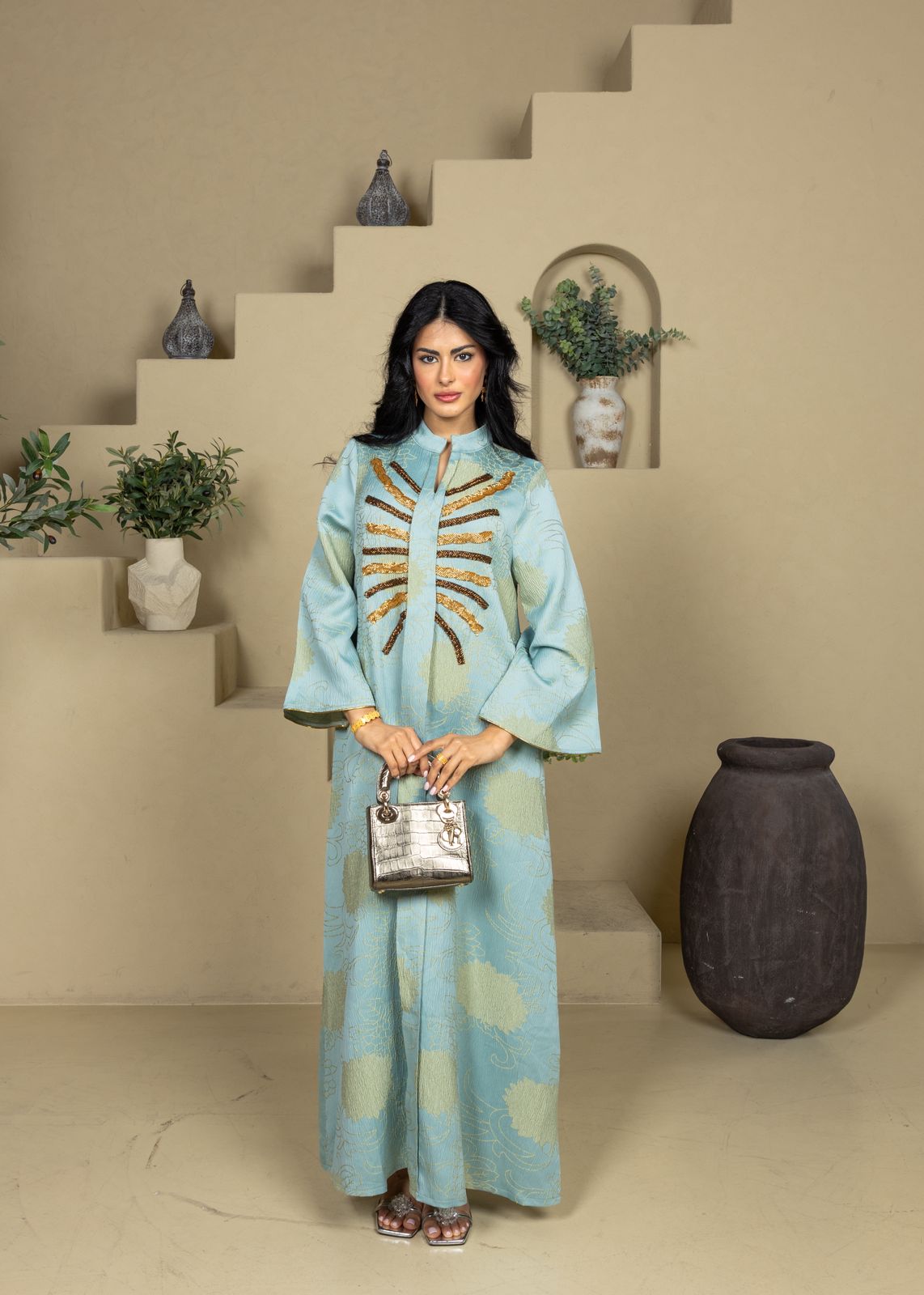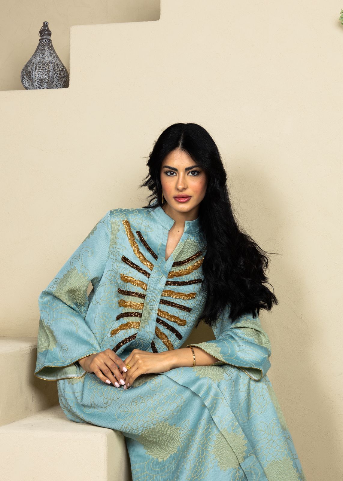 A statement Ramadan caftan designed in a straight, elegant silhouette with wide classic caftan sleeves. Crafted from textured lightweight fabric featuring a subtle floral weave, and distinguished by bold vertical embroidery along the front panel. The embroidery is inspired by palm motifs, reflecting regional heritage and the iconic Palm Jumeirah design, executed in rich gold and bronze tones for a refined statement. A structured neckline and balanced proportions complete the look, making this piece ideal for Ramadan evenings and special gatherings.