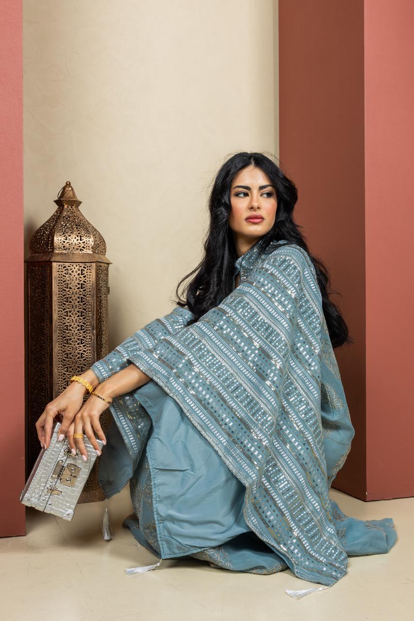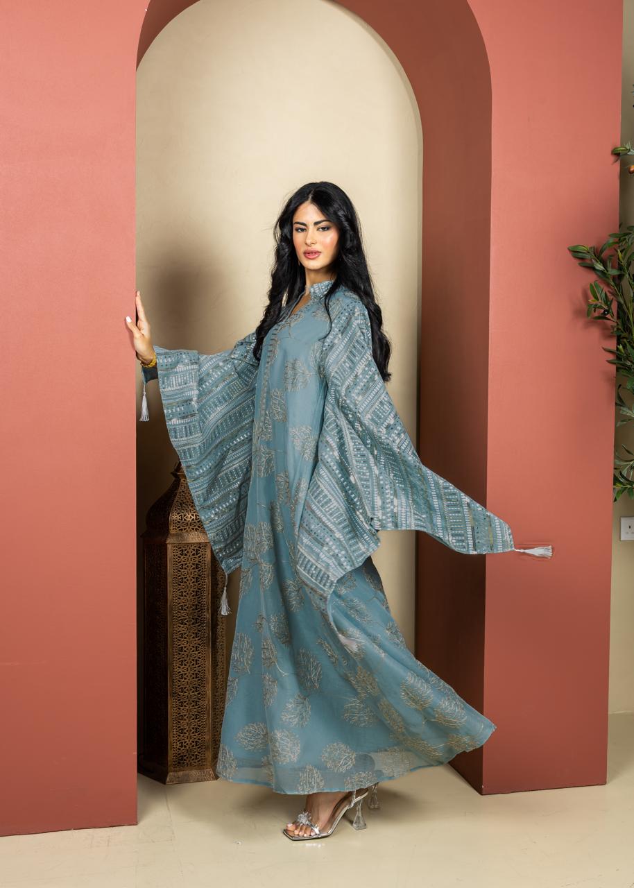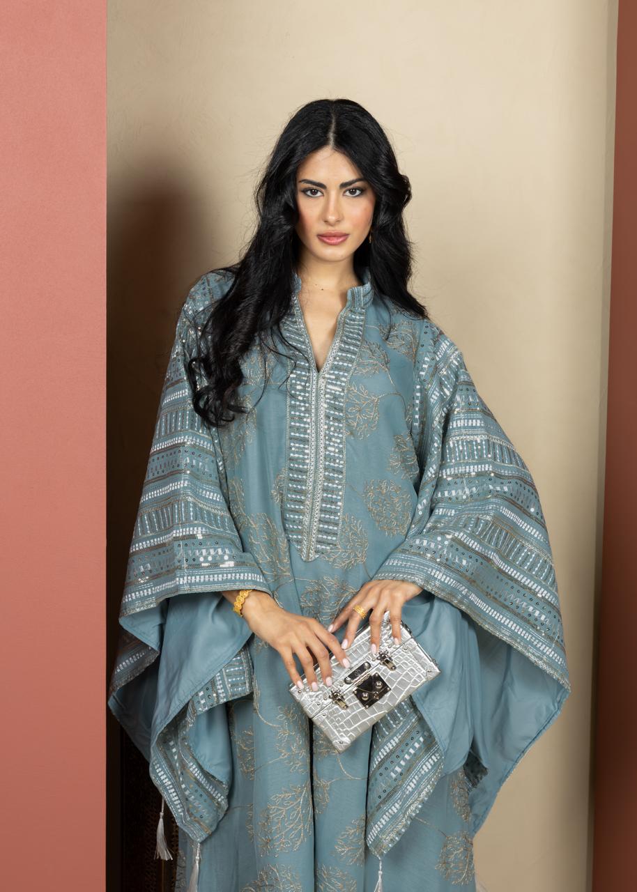 An elegant Ramadan caftan designed in a relaxed silhouette with wide kimono-style sleeves for effortless movement and comfort. Crafted from lightweight fabric and detailed with delicate embroidery and subtle embellishments along the neckline and sleeves. Finished with refined tassel accents, this piece offers understated luxury, making it ideal for Ramadan gatherings and special evening occasions.