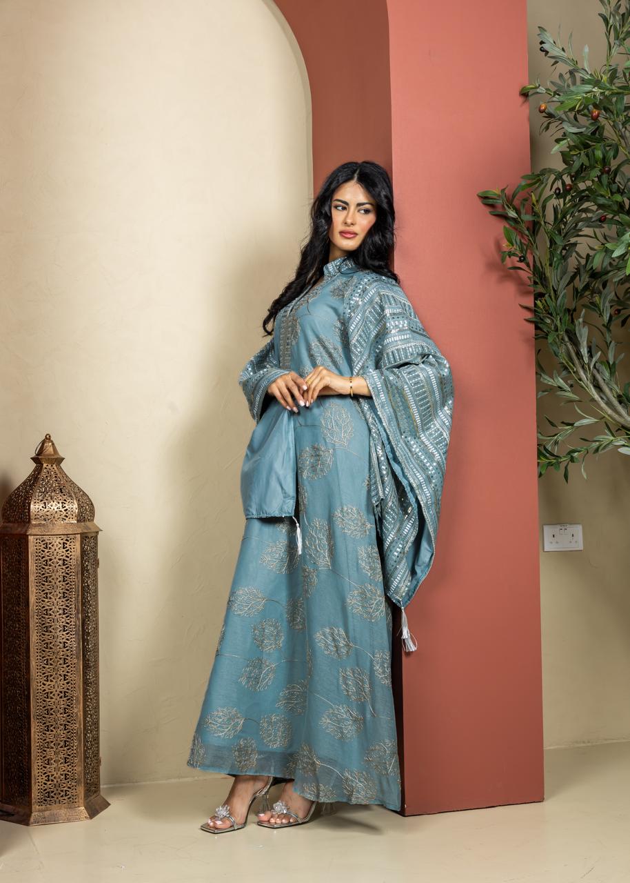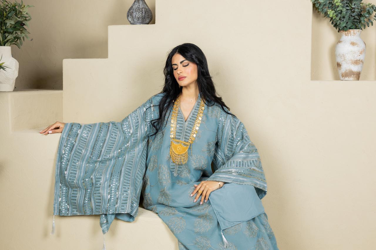 قفطان رمضاني أنيق بتصميم انسيابي وأكمام واسعة بأسلوب الكيمونو تمنح راحة وأناقة ناعمة. مصنوع من قماش خفيف ومريح، ومزين بتطريزات دقيقة وتفاصيل راقية عند فتحة الرقبة والأكمام، مع لمسة الشرابات التي تكمل فخامة التصميم. خيار مثالي لعزائم رمضان والمناسبات المسائية الخاصة بإطلالة راقية ومحتشمة.