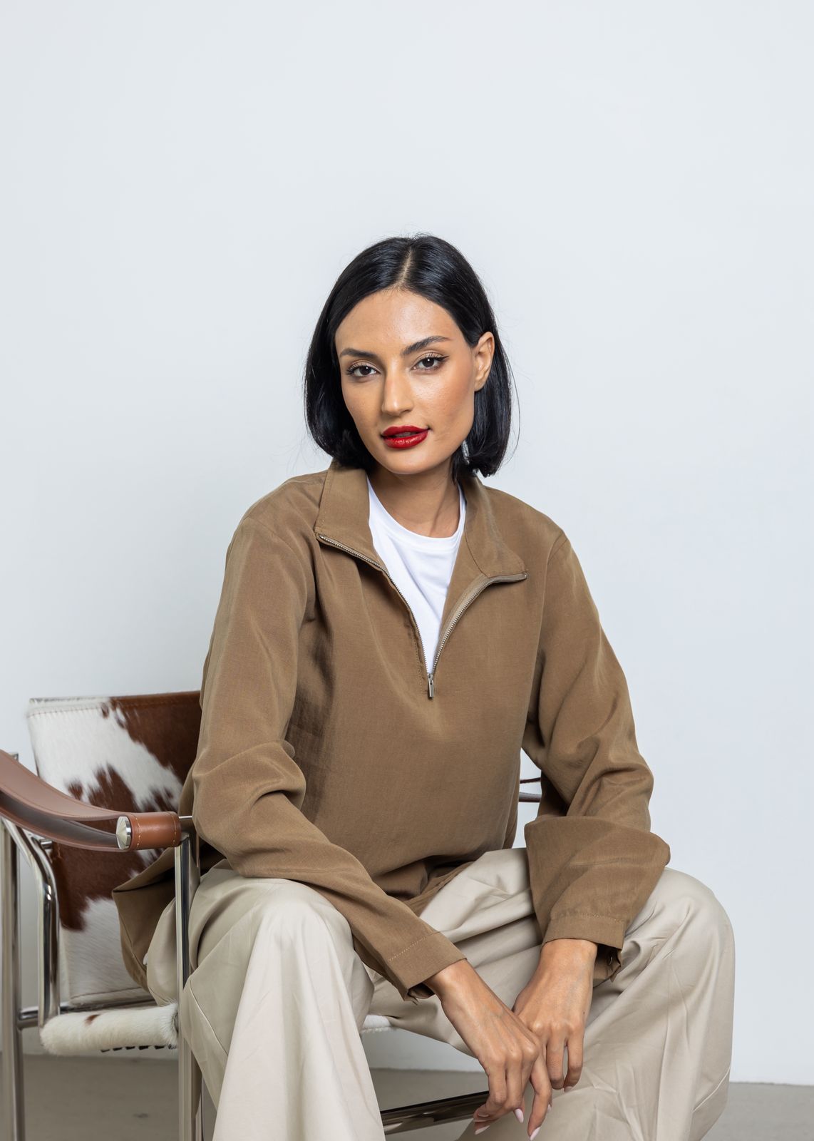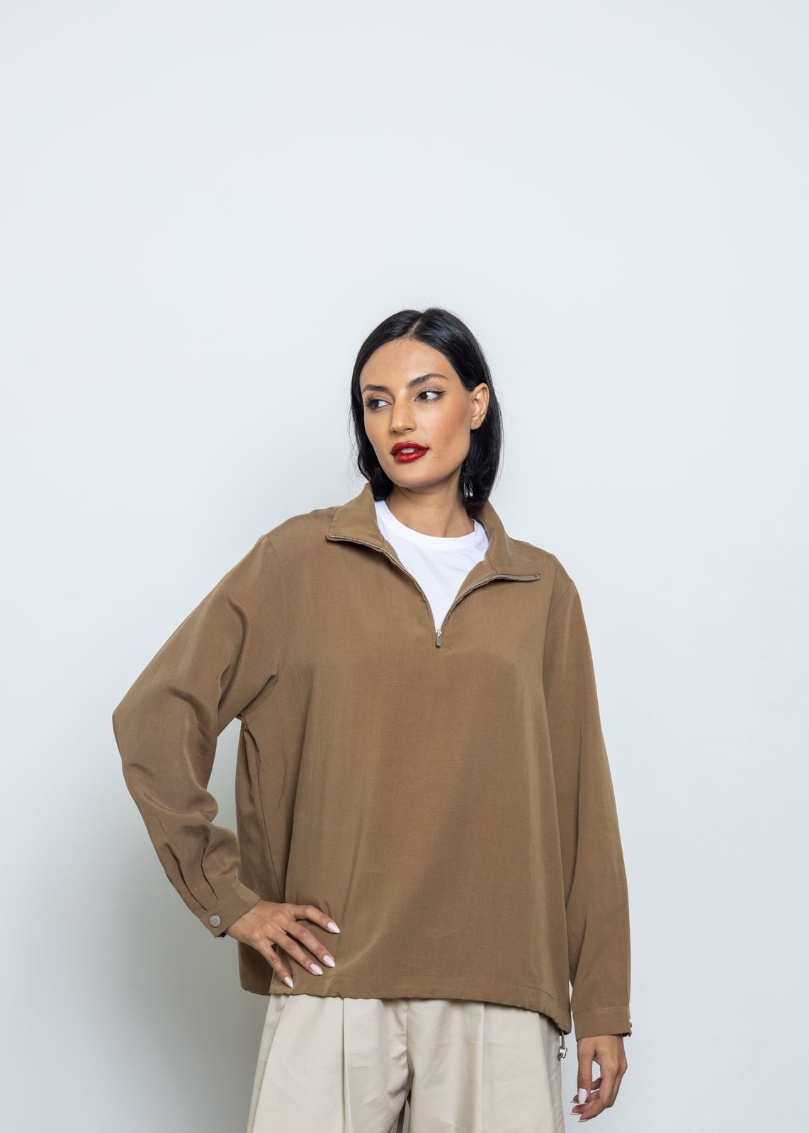 يأتي بقصة مريحة مع سحاب نصفي وياقة ناعمة، ليجمع بين الراحة والطابع العصري البسيط. خامته خفيفة ومسامية، مناسبة للارتداء بمفرده أو مع طبقات أخرى.