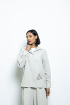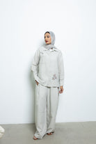 يتكوّن من قميص بقصة واسعة مع تطريزات ناعمة وبنطال واسع يمنح راحة وانسيابية عالية. يمكن تنسيقه كطقم كامل أو ارتداء كل قطعة على حدة لإطلالات متنوعة.