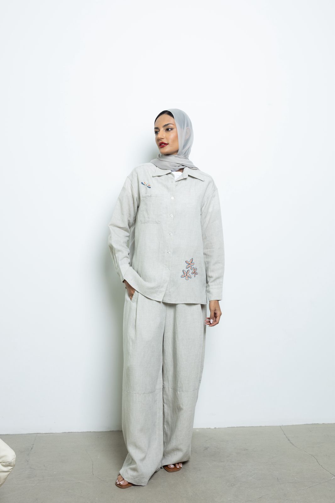 طقم من الكتان بقصة مريحة مثالي للإطلالات اليومية الهادئة.