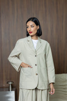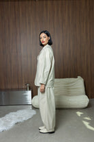 Featuring a relaxed blazer with a soft structure and wide-leg pants with an adjustable waist for all-day comfort. Crafted from breathable fabric, this set is perfect for warm days while maintaining a polished, modern look.