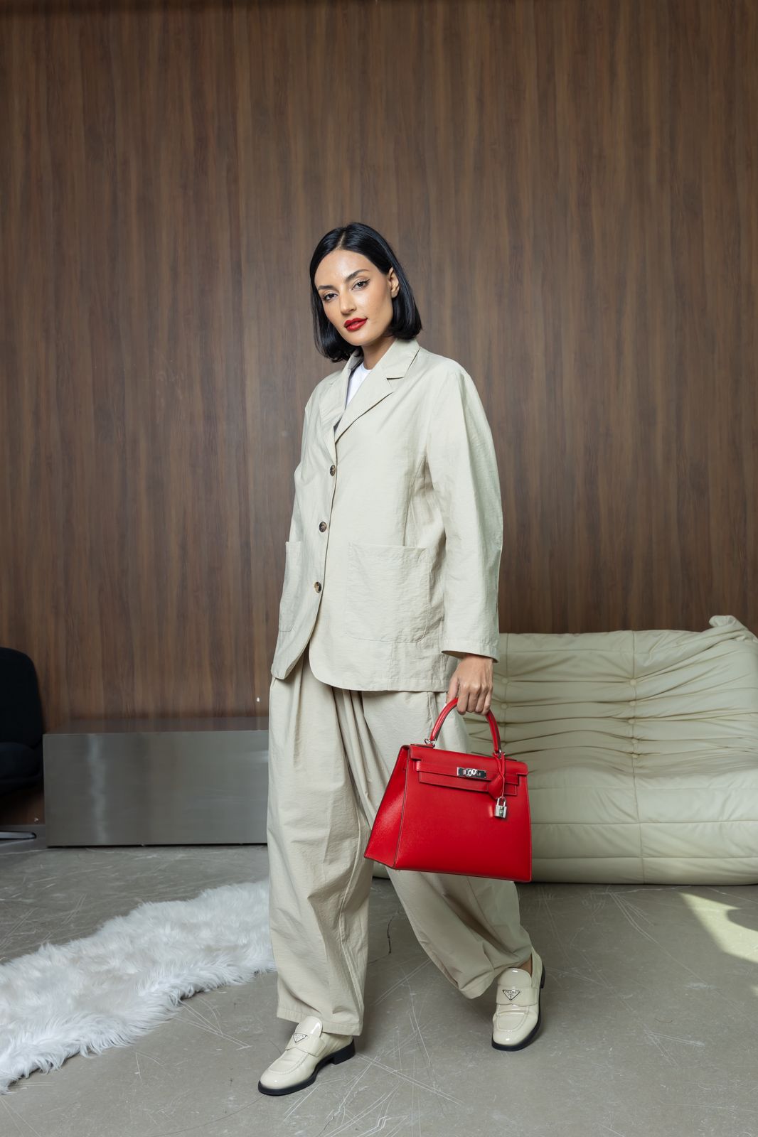 تتكوّن من بليزر بقصة مريحة وهيكل ناعم مع بنطال واسع بخصر قابل للتعديل لراحة تدوم طوال اليوم. مصنوعة من خامة خفيفة ومناسبة للأجواء الدافئة مع مظهر أنيق ومرتب.